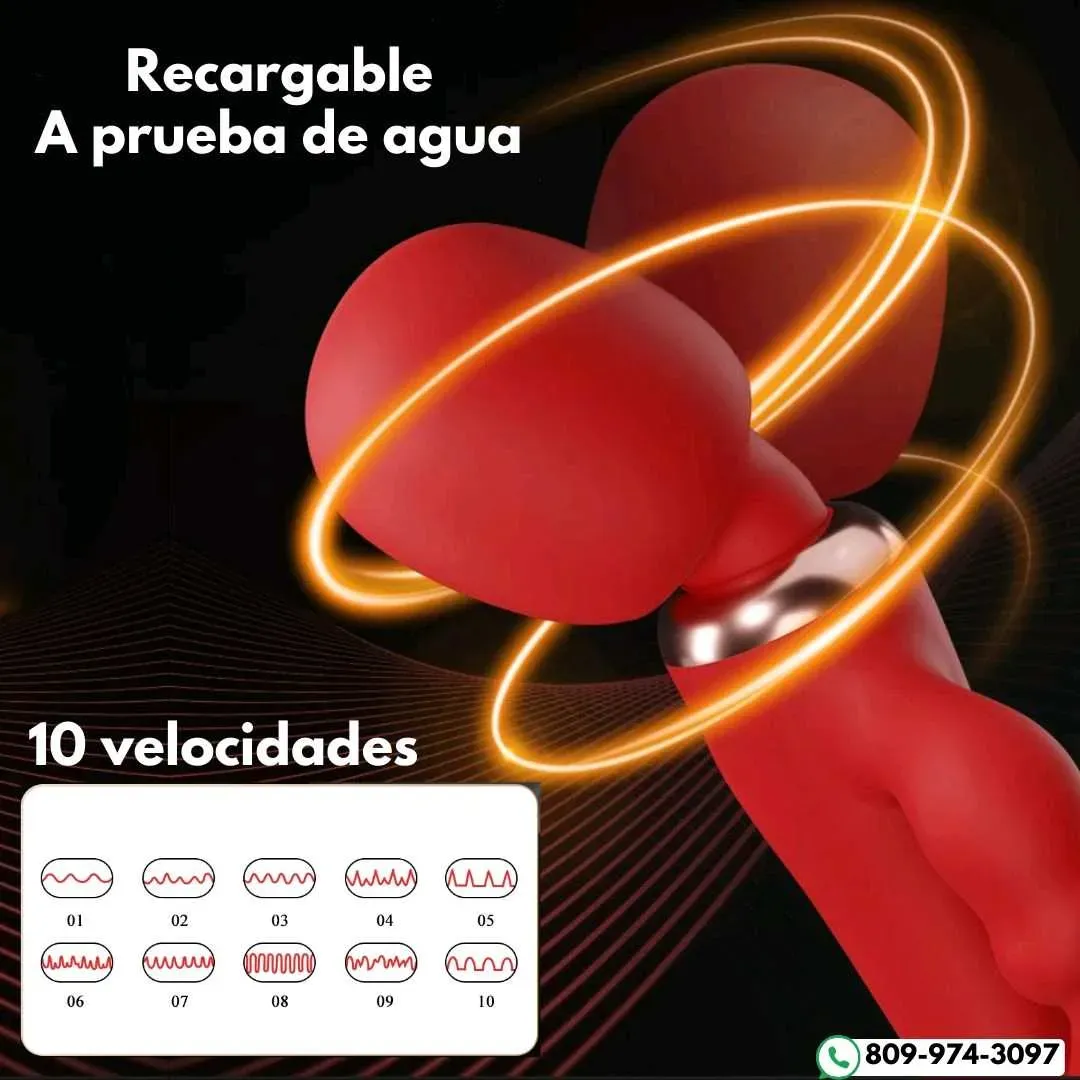 Este vibrador 3 en 1 combina masajeador, vibrador para penetración y estimulador de clítoris en un solo juguete. 10 velocidades en cada función, recargable y a prueba de agua.